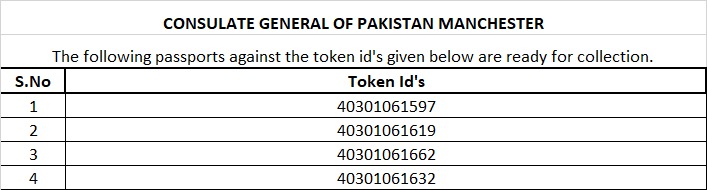The passports against the following token Id’s are ready for collection at the Consulate General of Pakistan, Manchester from Tuesday, 14th April, 2026.