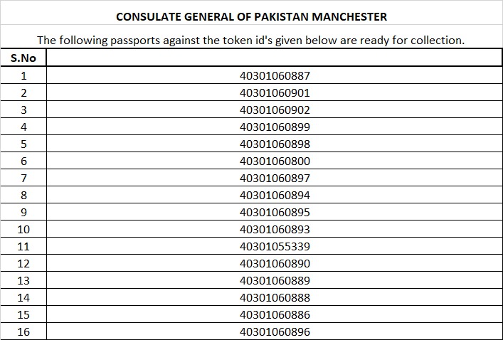 The passports against the following token Id’s are ready for collection at the Consulate General of Pakistan, Manchester from Thursday, 26th February, 2026.