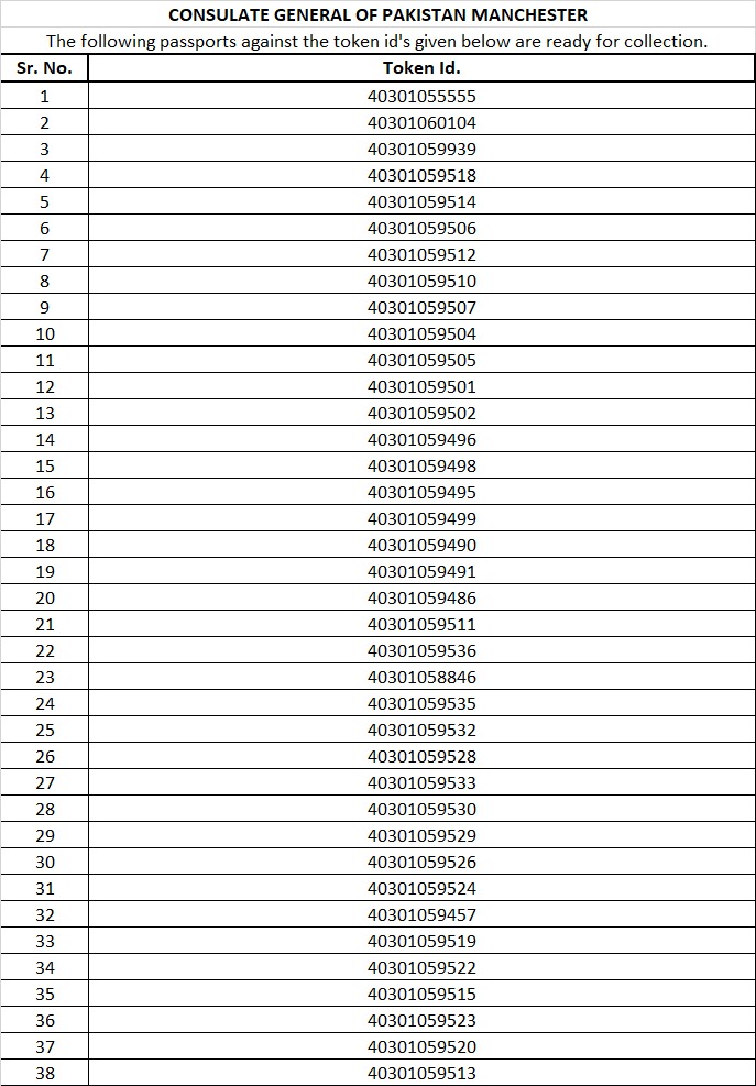 The passports against the following token Id’s are ready for collection at the Consulate General of Pakistan, Manchester from Thursday, 29th January, 2026.