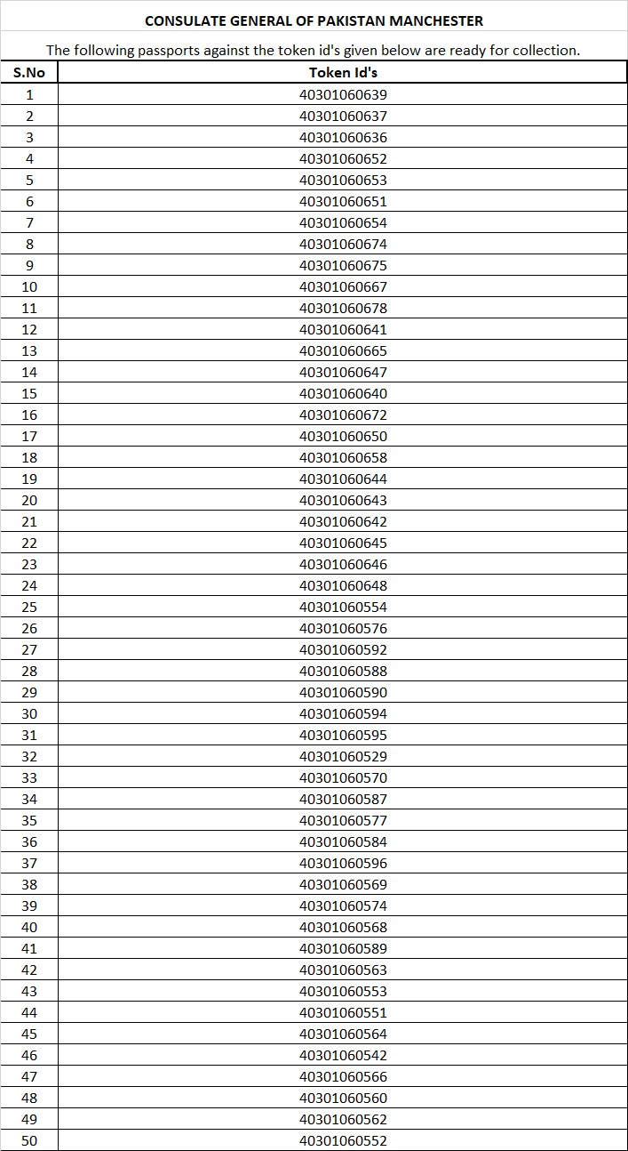 The passports against the following token Id’s are ready for collection at the Consulate General of Pakistan, Manchester from Tuesday, , 17th February, 2026.