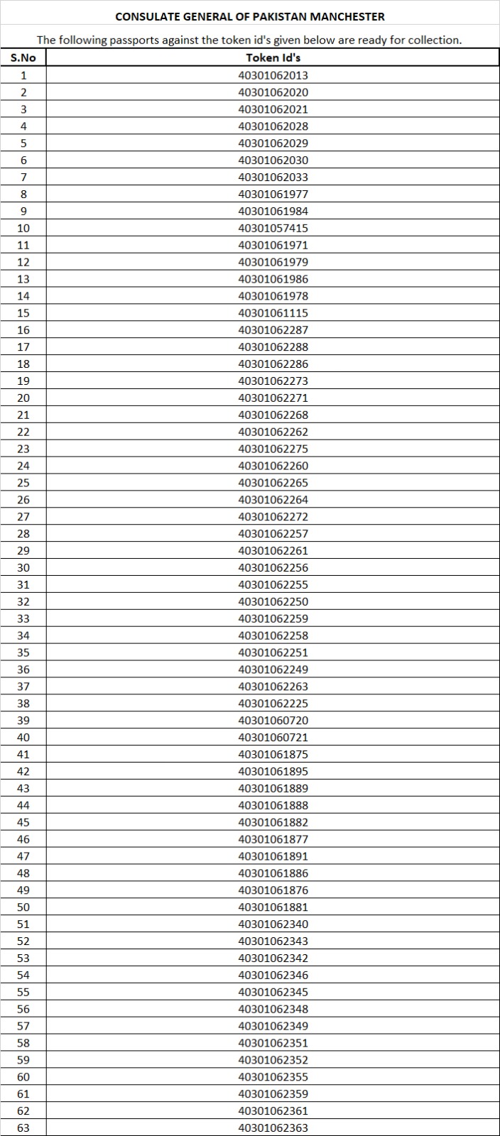 The passports against the following token Id’s are ready for collection at the Consulate General of Pakistan, Manchester from Wednesday, 29th April, 2026.